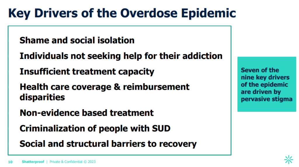 Ms. McKeon explained that seven out of the nine leading causes of the opioid crisis stem from stigma. These include feeling socially isolated, not getting help, not having enough treatment options, differences in insurance coverage, treatments not based on evidence, criminalizing people with substance use disorders, and social obstacles to recovery.