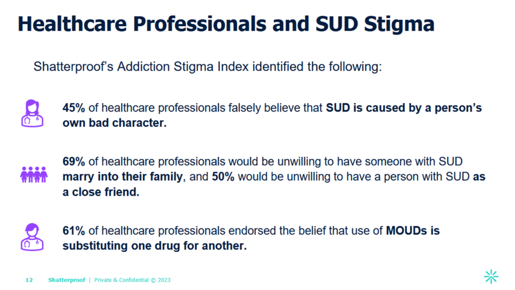 The findings of national surveys using the tool are that 67% of health care professionals do not believe SUD is a chronic medical condition, 45% attribute SUD to “bad behavior,” and 61% view medication-assisted treatment (MAT) as simply substituting one drug for another. In addition, 69% of health care professionals would be unwilling to have someone with SUD marry into their family, and 50% would be unwilling to have a person with SUD as a close friend.