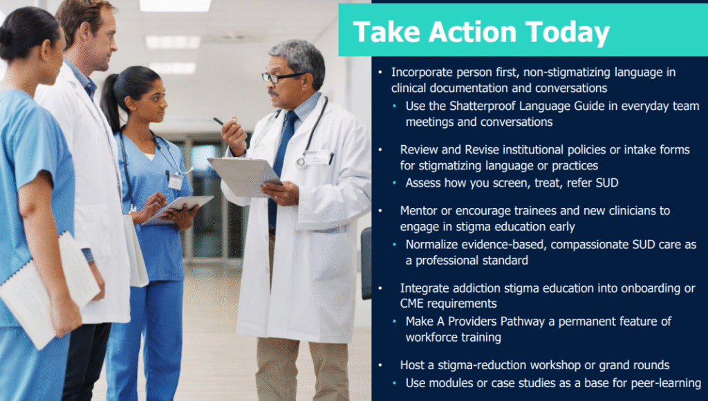 The second, and biggest step, is for executives to integrate stigma reduction training into clinical onboarding, continuing education, and leadership development. This approach should include mentorship for new clinicians and provide ongoing resources like stigma-reduction workshops and peer learning. The key is to understand that this training should be focused on changing behavior, not just giving clinicians new knowledge. The critical and practical skill that training should impart is the ability to interact with and support colleagues and patients experiencing SUD challenges.